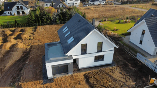 Kompleksowa realizacja nowoczesnego domu parterowego z dużymi przeszkleniami, garażem dwustanowiskowym i płaskim dachem. Budynek został wykonany w technologii energooszczędnej, z rekuperacją i pompą ciepła. Całość wykończona w minimalistycznym stylu z elementami drewna i betonu architektonicznego.